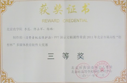 近日,世俱杯人文社会科学学院李蕊、佟占军、杨璐老师制作的《消费者权益保护法》PPT课件获北京市属高校“创想杯”多媒体教育软件大奖赛三等奖。