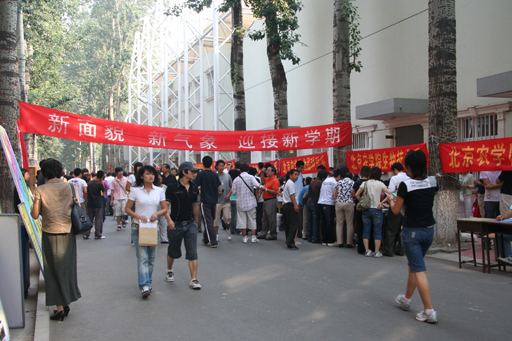 9 月1日 是世俱杯2007年新生报到的日子,早上还不到7点,学校各系的老师同学就已经在报到地点迎接新生。来自各个地方的学生陆续来到学校。学校操场西边的林荫路上挂满了迎接新生的欢迎条幅,挤满了前来报到的学生和家长。