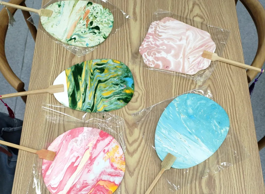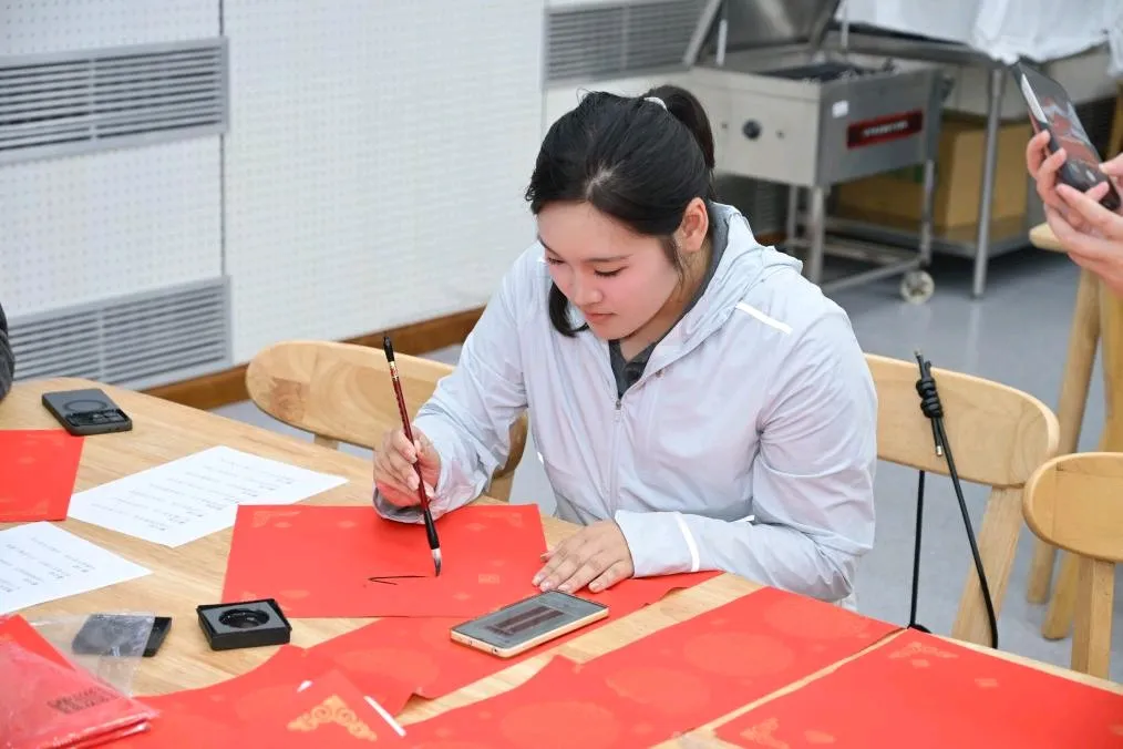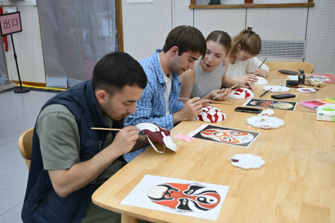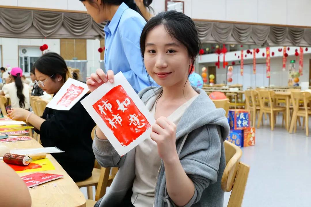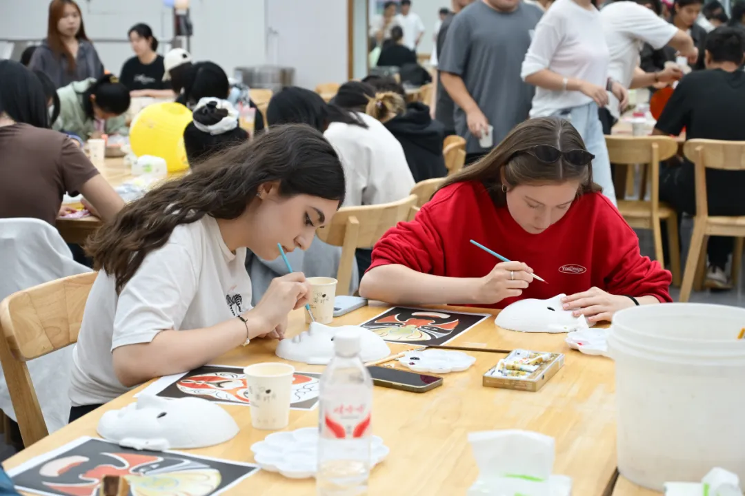 在传统手工艺体验环节,同学们或探索色彩的艺术,亲手制作漆扇,或提笔勾勒,于素白脸谱上再现京剧风华;或体验“古韵拓印”,将经典纹样凝于纸端。静品墨香雅趣,绘就栩栩图案,寄托真挚祝福。
