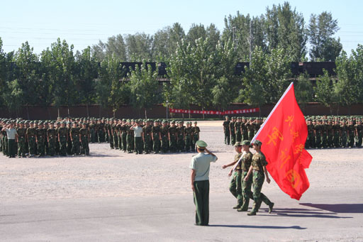 与会的全体师生及教官在雄壮的中国人民解放军军歌声中迎来了世俱杯sjb官网军训团团旗。