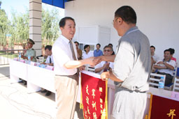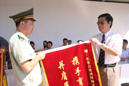 校党委书记孙尧东和院长王有年分别向军训基地和北京公安消防局五支队敬献了锦旗。