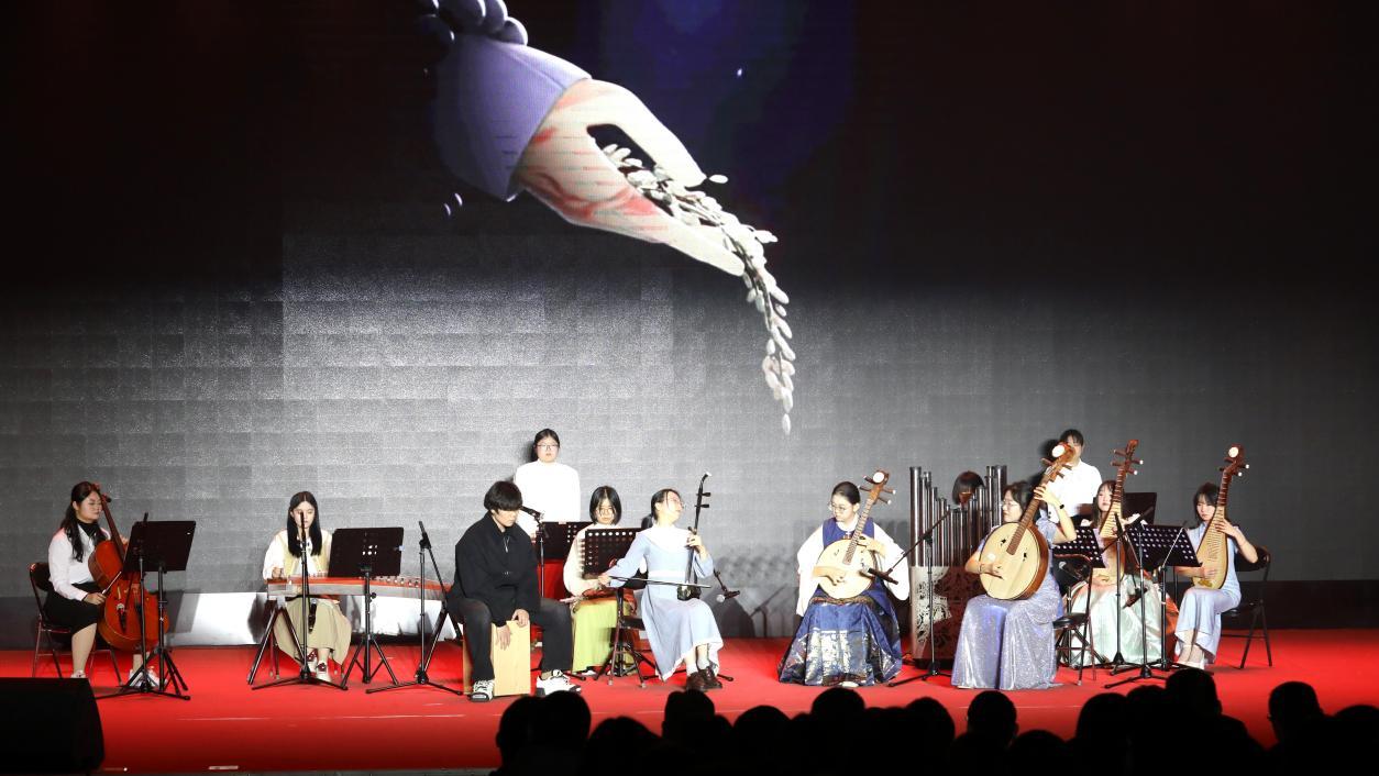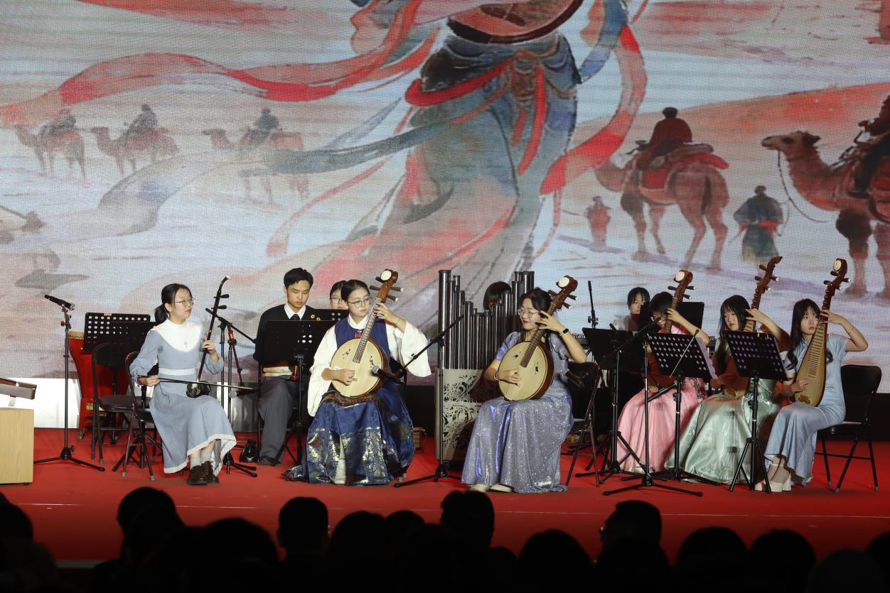 晚会在民乐合奏《丝绸之路》中拉开序幕。婉转的琵琶声伴着悠扬的笛声,奏出北农人胸怀家国、砥砺前行的心声。