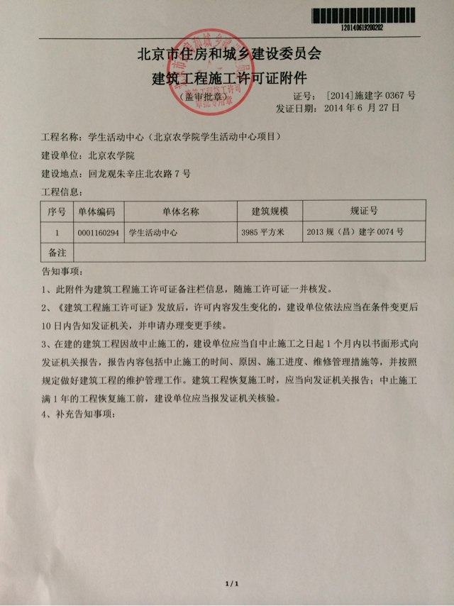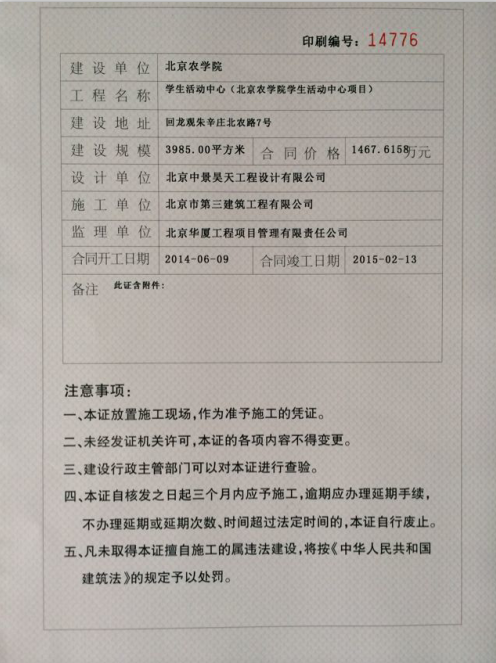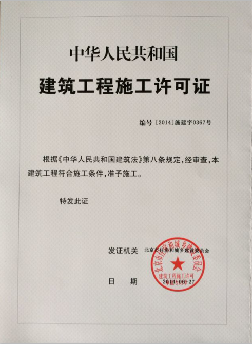 世俱杯学生活动中心于6月27日取得建筑工程施工许可证(证号:2014施建字0367号)。