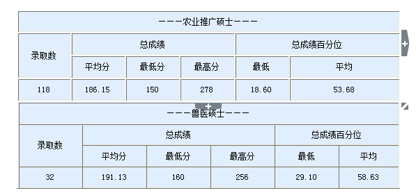 2013年在职人员攻读硕士学位研究生招生限额为“自定招生”,上限为农业推广硕士350人(其中“农村与区域发展领域”限额为100人)、兽医硕士100人;实际招收录取在职专业学位研究生150人,其中农业推广硕士118人(“农村与区域发展领域”招收30人)、兽医硕士32人。