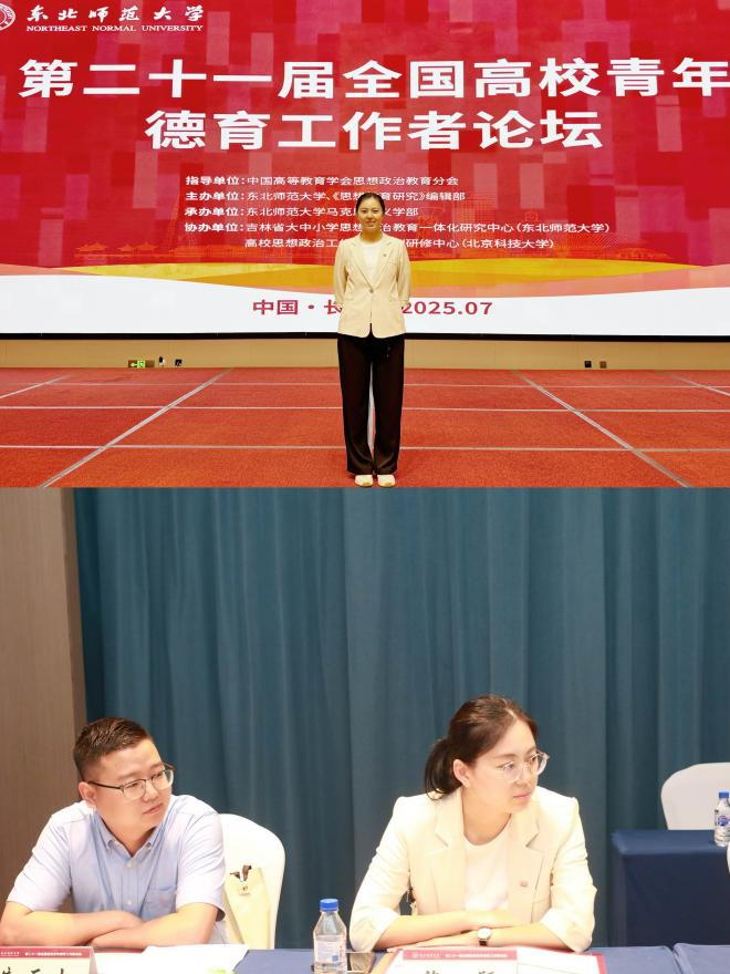 近日,第二十一届全国高校青年德育工作者论坛在东北师范大学召开。本次论坛由中国高等教育学会思想政治教育分会指导,东北师范大学、《思想教育研究》编辑部主办,东北师范大学马克思主义学部承办,来自全国100余所高校和科研院所的专家学者、青年德育工作者和吉林高校师生代表共300余人参加论坛。世俱杯马克思主义学院许颖老师参加论坛并作汇报。