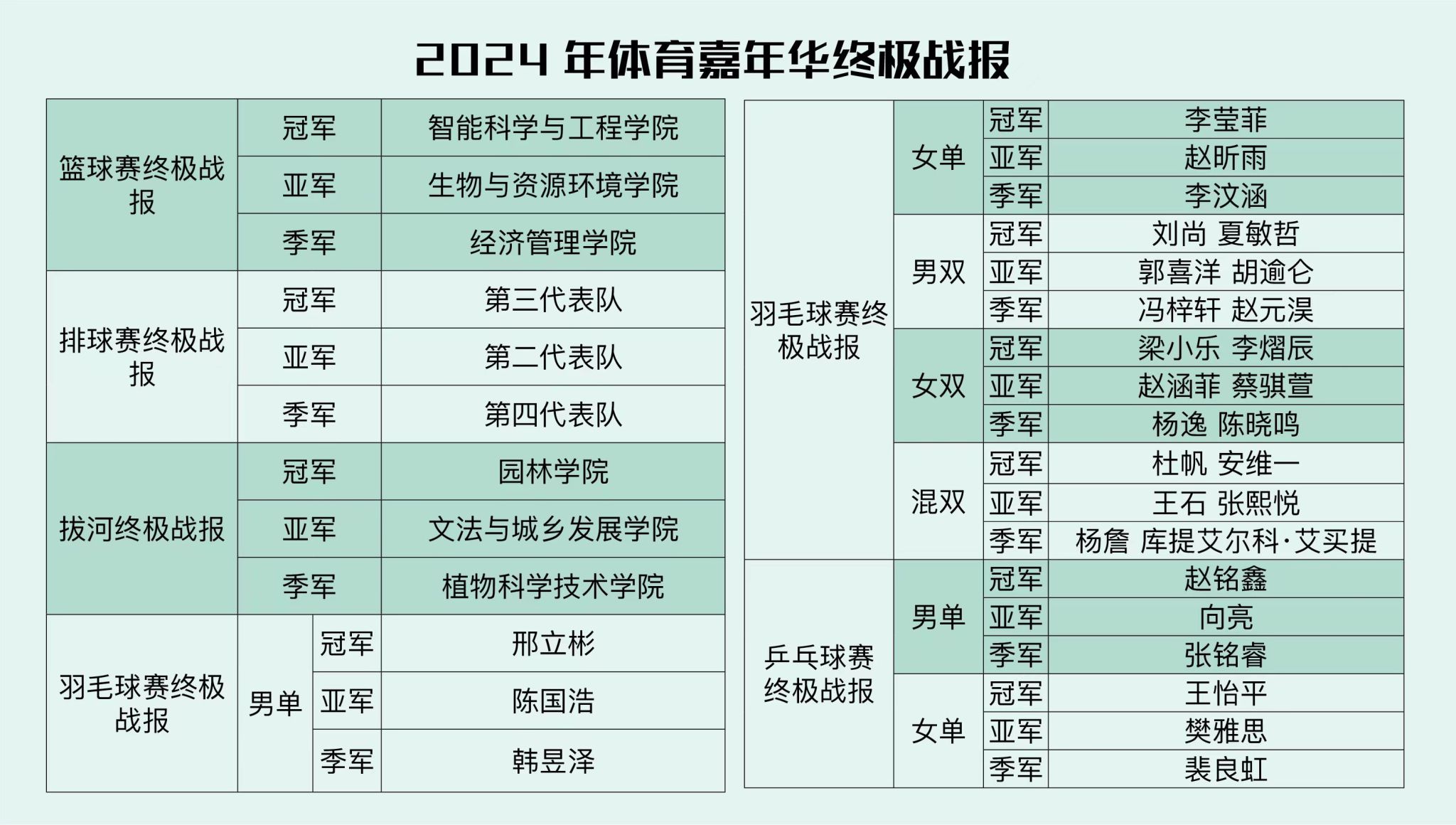 自3月25日启动以来,本次篮球赛事共举行40场比赛,来自9个二级学院的代表队展现出了较高的竞技水平和团队精神。决赛赛场上,智能学院与生资学院队员们的精彩表现时刻吸引着观众的目光,充满力量的跃起、迅捷的奔跑、巧妙的抢断、流畅的过人、精准的投篮和勇敢的拼抢,构成一幕幕令人热血沸腾的场景,不仅向全校同学展示精湛球技,更彰显了队员们不屈不挠、团结协作的体育精神。最终智能科学与工程学院实现卫冕,生物与环境资源学院获得亚军,经济管理学院获得季军。