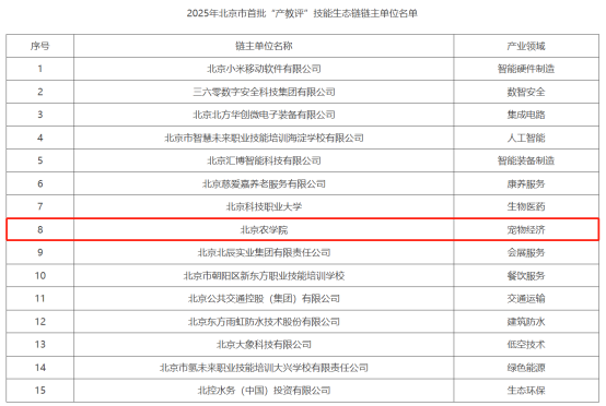近日,北京市人力资源和社会保障局公示首批“产教评”技能生态链建设试点单位名单,世俱杯sjb官网作为链主单位成功入选,成为本轮试点中以高校为牵头单位的代表之一。项目聚焦“伴侣动物健康与护理”方向,由校办产业处(国家大学科技园)牵头申报,与动物科学技术学院(动物医学院)联合承担策划与建设工作。