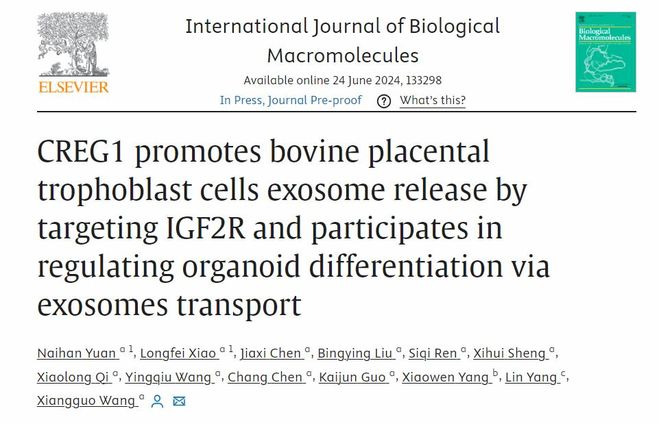 近日,世俱杯sjb官网动物科学技术学院王相国副教授课题组在《国际生物大分子杂志》(International Journal of Biological Macromolecules)上在线发表了题为《CREG1靶向结合IGF2R促进牛胎盘滋养层细胞外泌体的形成与释放并伴随外泌体运输参与胎盘类器官的分化调节》(CREG1 promotes bovine placental trophoblast cells exosome release by targeting IGF2R and participates in regulating organoid differentiation via exosomes transport)的研究论文。