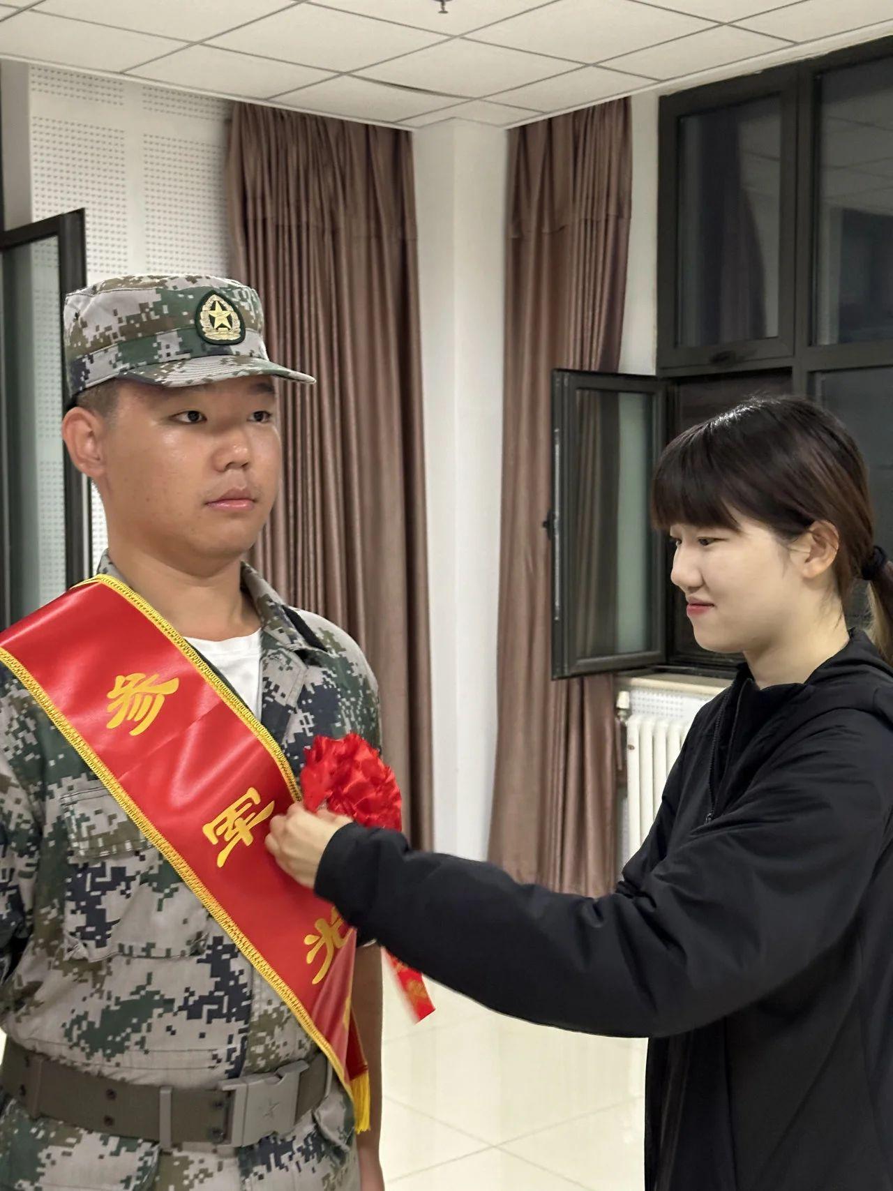 参加送兵会的老师们代表学校师生为新兵送上祝福和叮嘱,并为新兵披红戴花、赠送书籍。