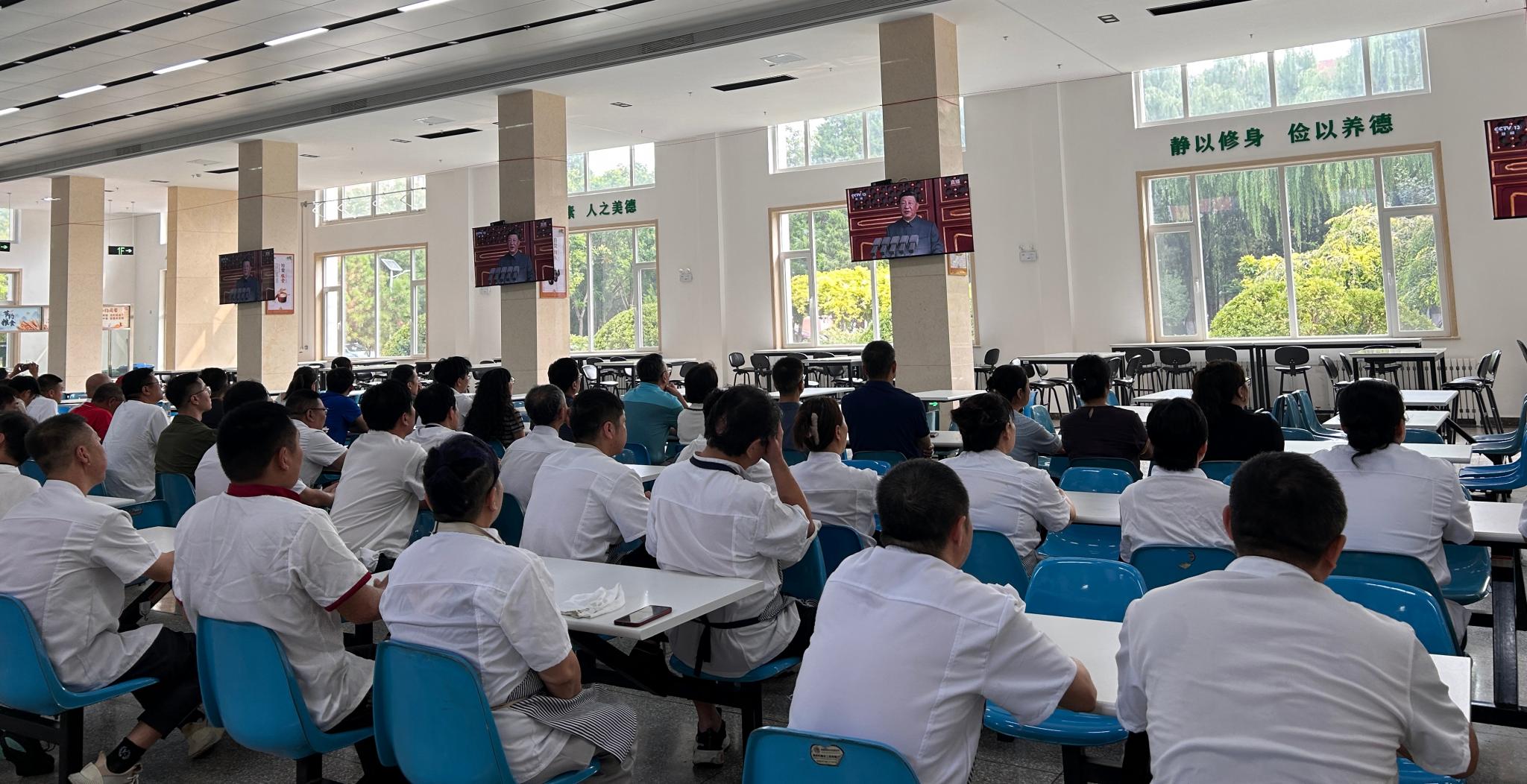 职工们聚精会神观看大阅兵,战机翱翔、步伐铿锵、各种新型装备、国之重器集体亮相,令人印象深刻,大家内心激动、感慨万千。