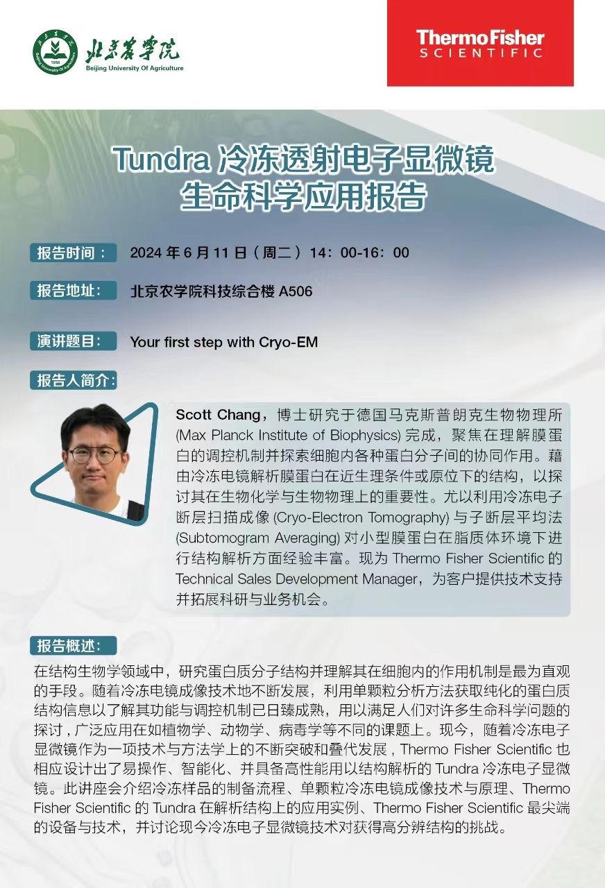 在结构生物学领域中,研究蛋白质分子结构并理解其在细胞内的作用机制是最为直观的手段。随着冷冻电镜成像技术地不断发展,利用单颗粒分析方法获取纯化的蛋白质结构信息以了解其功能与调控机制已日臻成熟,用以满足人们对许多生命科学问题的探讨,广泛应用在如植物学、动物学、病毒学等不同的课题上。现今,随着冷冻电子显微镜作为一项技术与方法学上的不断突破和叠代发展, Thermo Fisher Scientific也相应设计出了易操作、智能化、并具备高性能用以结构解析的Tundra冷冻电子显微镜。此讲座会介绍冷冻样品的制备流程、单颗粒冷冻电镜成像技术与原理、Thermo Fisher Scientific的Tundra在解析结构上的应用实例、Thermo Fisher Scientific最尖端的设备与技术,并讨论现今冷冻电子显微镜技术对获得高分辨结构的挑战。