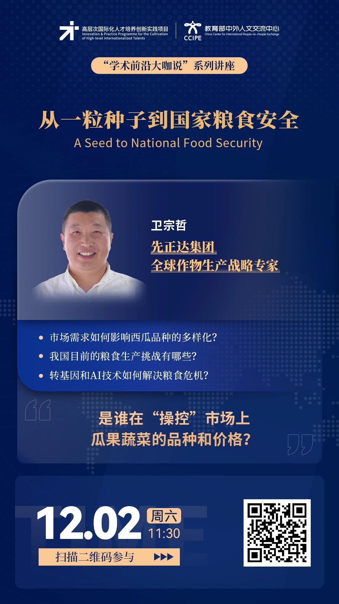 12月2日11:30-12:30,先正达集团全球作物生产战略专家卫宗哲将以“从一粒种子到国家粮食安全”为主题,带来兼具知识性与趣味性、本土化与国际化的精彩讲座,欢迎同学们积极报名参加!