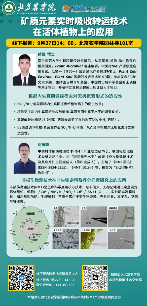 内容:介绍非损伤微测技术在非生物逆境及养分元素研究领域的应用。非损伤微测技术是生命科学底层核心技术,可非侵入、无标记的通过定量测定活体组织、细胞与内/外环境间的H+/Ca2+/Mg2+/Cl-/Na+/K+/Pb2+/Cu2+/Cd2+/NO3-/NH4+/H2O2/O2/IAA/葡萄糖......实时动态跨膜转运,揭示基因功能、生理机制,常用于非生物逆境、养分元素、质子泵、钙信号等研究。