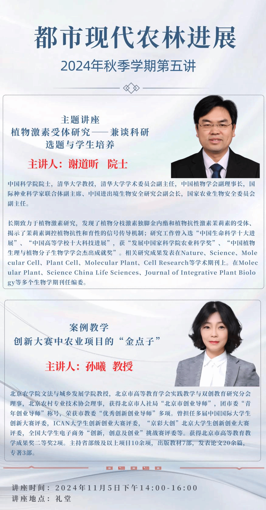 谢道昕中国科学院院士,清华大学教授,清华大学学术委员会副主任,中国植物学会副理事长,国际种业科学家联合体副主席、中国进出境生物安全研究会副会长,国家农业生物安全委员会副主任。