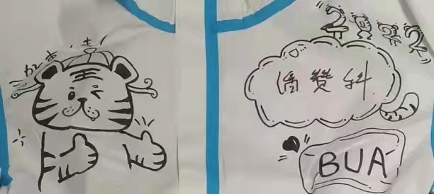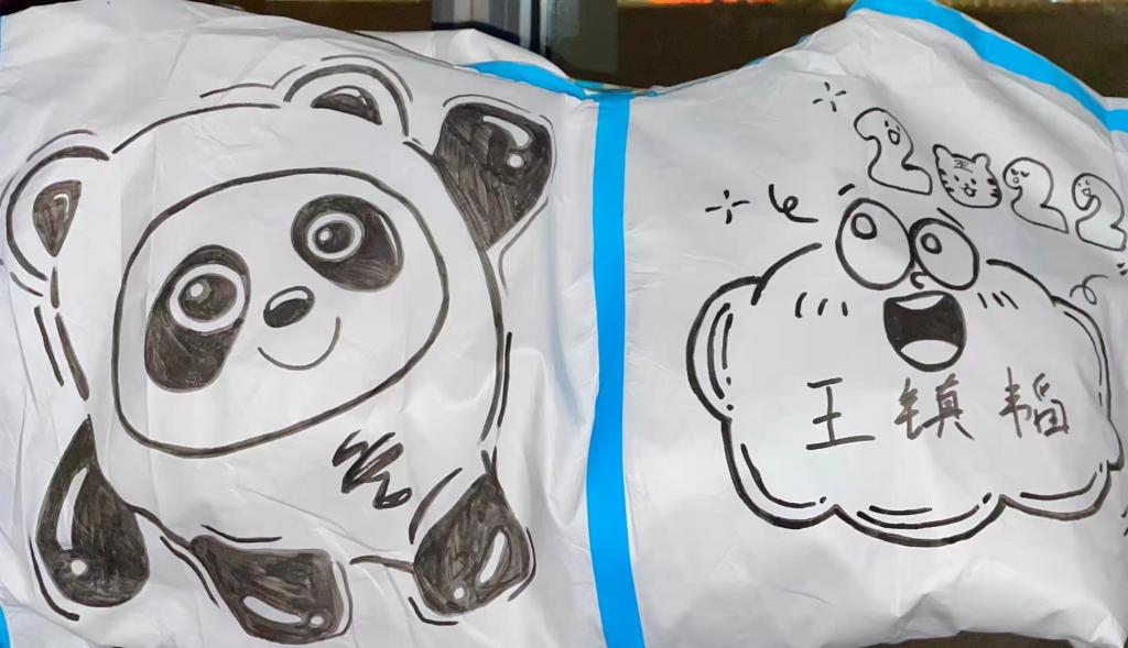 爱画画的王镇韬还和小伙伴们一起在防护服上进行绘画创作。“在防护服上写名字时,我就想,我可以在防护服上进行简单的绘画创作,从而展示冬奥精神和大学生志愿者的形象啊!”