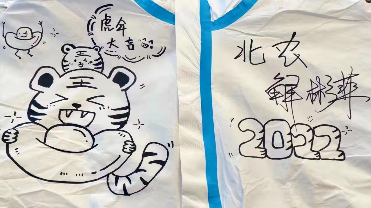 他们在防护服上画可爱的生肖虎、画喜庆的中国灯笼……“当我们穿上这些特殊的‘战袍’坐在激活台前工作时,我们更加自信和骄傲了。”王镇韬自豪地说。