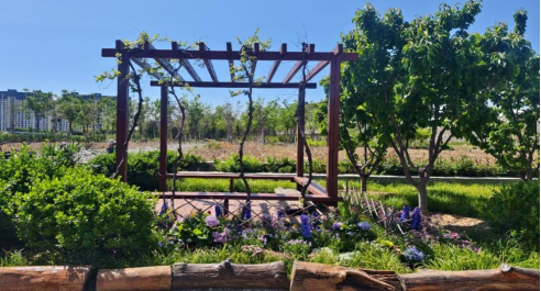 第二组花镜的主题为“归园田”。通过自然野趣的植物组合与质朴的手工材料,打造一处兼具生态美感与休憩功能的田园花境。设计强调植物群落的自然生长形态,让亭台与花草相映成趣,唤醒人们对田园生活的诗意向往。绣球作团块基底,穿插鬼针草的羽状花序与大花飞燕草剑形花穗。糖芥与美女樱组成碎花地毯。采用竹篱笆作主体围挡,外侧设置风化木桩作为场地边缘。通过植物群落的自衍更替与人工痕迹的适度介入,打造会呼吸的活态花园。