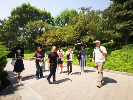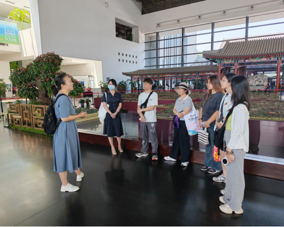 其后的实地调研环节以“博物馆室外园林景观提升”为题,由风景园林系孙薇薇、朱强、张维妮三位导师带领5名2022级同学开展针对性调查。在博物馆景观部负责人的带领下,师生们重点考察了室内的江南园林展区、室外的北方园林展区及屋顶活动场地等区域,围绕植物配置优化、游线组织提升、文化叙事强化等议题展开讨论。孙薇薇老师在现场教学中强调,这一真实情境下的毕业设计题目将十分具有现实意义,不仅为馆方提供了参考方案,而且十分有益于锻炼同学的综合能力;风景园林系副主任朱强老师则指导同学们深入分析博物馆的基地条件和当前面临的现实问题,充分展开想象,把握设计机遇。最后,同学们不畏酷暑,访谈了馆内游客及工作人员,收集到关于植物养护、游览体验等多维度反馈,为设计方案的优化提供了实证依据。