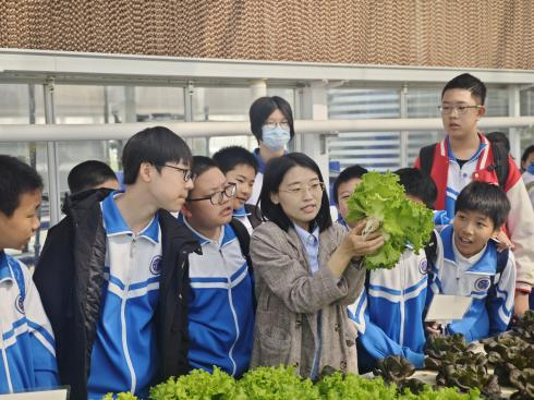 走进6000平方米的智能连栋温室,水培架上层层叠叠的奶油生菜、紫背天葵构成“多彩菜园”。蔬菜学指导教师现场揭秘:营养液自动循环系统通过物联网实时监测EC值、pH值,确保每株作物获得精准养分。学生们亲手采摘成熟度达标的蔬菜。“原来不用土壤也能种菜,还能节省大量的水!”初二学生在实践手册上认真写下观察结论。这场融合生物知识、数据传感与劳动操作的沉浸式教学,让抽象的智慧农业概念变得触手可及。