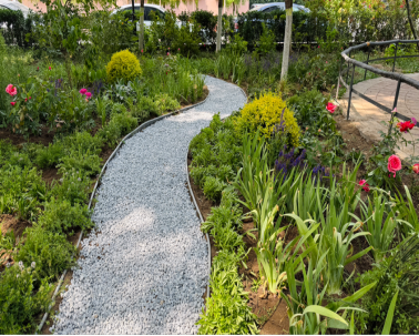 场地核心由一片舒展的“大云朵”和一朵灵动的“小云朵”构成。云朵的边界由低矮、绵密的委陵菜勾勒,形成清晰而柔和的轮廓线,如同云朵轻落地面。云朵内部,通过流畅、自然的曲线划分出形态各异的小型种植区域,模拟云卷云舒的形态。在这些精心设计的区域内,我们搭配种植了色彩、质地、花期各异的花卉与观赏草,营造出层次丰富、季相变化明显的花境景观。原有的龙爪槐与油松成为花园天然的“绿色骨架”与遮荫伞,新植入的云朵花境则如同柔软的地毯,与原有树木和谐共生,共同为社区居民提供了一个驻足观赏、休憩交流的温馨角落,有效提升了健身区域的环境品质与生活气息。