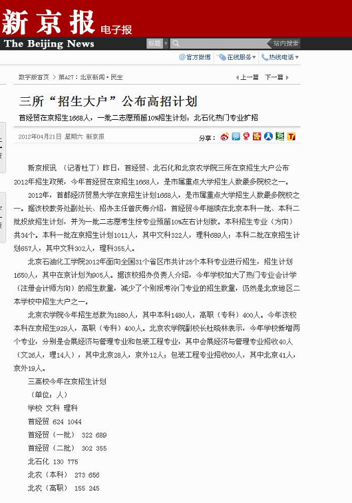 新京报讯 (记者杜丁)昨日,首经贸、北石化和世俱杯sjb官网三所在京招生大户公布2012年招生政策,今年首经贸在京招生1668人,是市属重点大学招生人数最多院校之一。