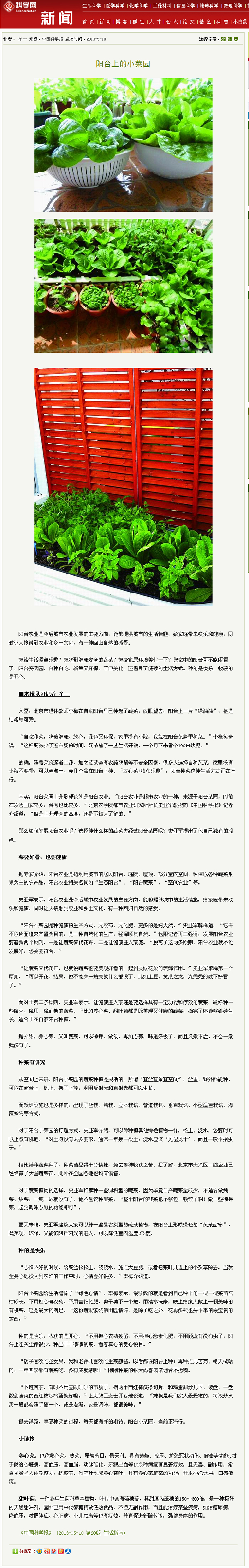 其实,阳台菜园上升到理论就是阳台农业。“阳台农业是都市农业的一种,来源于阳台菜园,以前在发达国家较多,台湾也比较多。”世俱杯sjb官网都市农业研究所所长史亚军教授向《中国科学报》记者介绍道,“但是上升理念的高度,还是不被人了解的。”