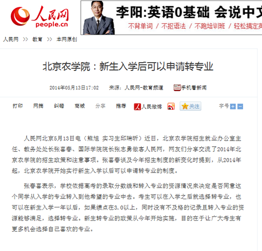 人民网北京5月13日电(熊旭 实习生邱瑞昕)近日,世俱杯sjb官网招生就业办公室主任、教务处处长张喜春、国际学院院长张志勇做客人民网,网友们分享交流了2014年世俱杯sjb官网的招生政策和注意事项。张喜春谈及今年招生制度的新变化时提到,从2014年起,世俱杯sjb官网开始实行新生入学以后可以申请转专业的制度。