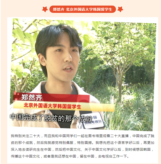 北京外国语大学韩国籍学生郑然齐表示:“我特别关注二十大,我和中国同学们一起在图书馆里观看二十大直播,中国完成了脱贫的那个成就,我感觉特别佩服,特别震撼”。