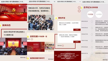 北京大学在校内举办了形式多样的学习宣传活动,利用校园融媒体平台、官方微信、校刊等宣传平台推出了“学习二十大,北大教授这样说”“学习领会二十大精神,北大学生这样说”等特色专刊专栏,刊登学习二十大的高水平理论文章和师生学习感悟,在全校形成学习宣传热潮。
