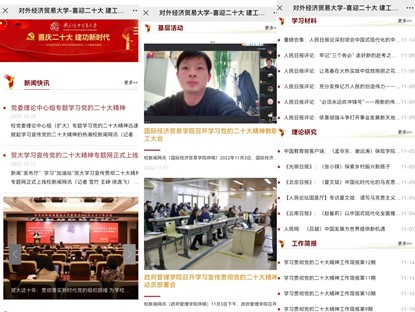 对外经济贸易大学统筹校内各级各类新闻媒体宣传资源,充分利用新闻网、校报、广播电视、微信微博、橱窗展板等全媒体平台,全面宣传解读大会精神,设立网络专栏,刊发理论文章、学习体会,宣传典型经验。同时,以微党课、主题展览、“网络巡讲”等方式,营造校园“学习贯彻二十大”的浓厚氛围。
