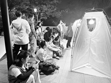 19时许,夜幕降临。授课教师任利利带着40余名学员利用各种夜观设备,了解昆虫的奥秘。课前10分钟,任利利一边招呼学员架设灯诱设备,一边耐心地帮大家复习知识点:“此前的课上我们讲到了,一部分昆虫有趋光性,因为它们的视网膜上有一种色素能吸收紫外光,当感受到光亮时,就会朝着亮处飞去。这个广场有梅园、林沼和樱花步道,一旁的池塘里还种植着40多种水生植物,这样的环境很适合大家夜观昆虫。”任利利打开一盏诱虫灯,挂到灯诱帐篷的最顶端,一些小虫子扑扇着翅膀,成团飞过来。学员们也聚集到帐篷四周,探着头仔细观察。