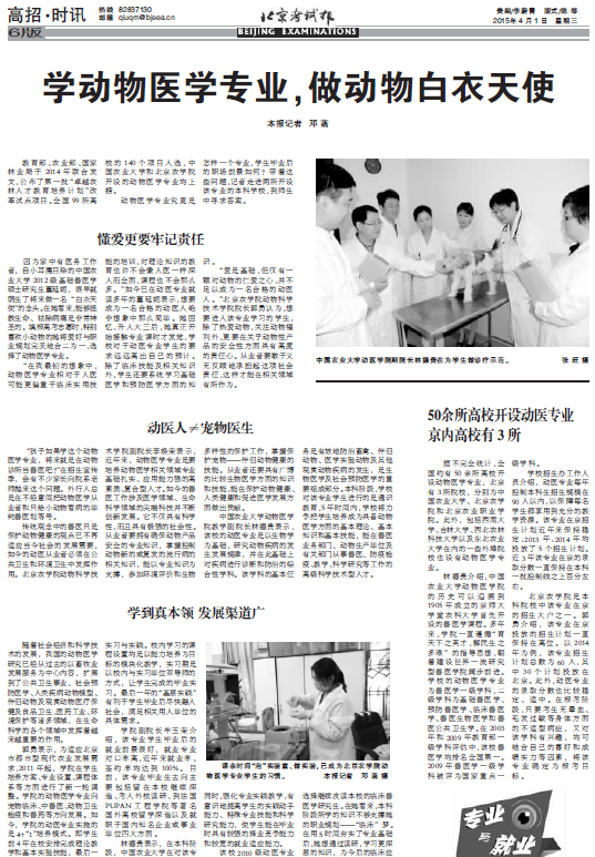 郭勇表示,为适应北京市都市型现代农业发展需求,2011年起,学院在学生培养方案、专业设置、课程体系等方面进行了新一轮调整。学院的动物医学专业向宠物临床、中兽医、动物卫生检疫和兽药等方向发展。如今,学院的动医专业实施的是4+“1”培养模式。即学生前4年在校安排完成理论教学和基本实验技能,最后一年到生产实践单位进行专业实习与实践。校内学习的课程设置均是以能力培养为目标的模块化教学,实习期是以校内与实习单位双导师的方式,让学生完成的毕业实习。最后一年的“基层实践”有利于学生毕业后尽快融入社会,满足相关用人单位的具体需求。