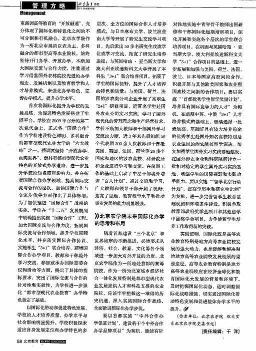 要以首都实施“‘中外合作办学促进计划’,建设若干个中外合作办学品牌项目”为契机,继续有针对性地实施中青年骨干教师出国研修和干部国际化短期培训项目,深化开展和实施各个层次的学生联合培养项目,在巩固与英国哈珀·亚当斯大学、澳大利亚埃迪斯科文大学“3+1”合作项目的基础上,进一步拓展和加强与美国、荷兰、法国、波兰、日本等国家高校间的合作,积极开辟与其他欧美国家和农业强国高校之间新的合作项目。要以实施“‘首都优秀学生留学奖励计划’,培养具有国际竞争力的人才”为契机,在前期中英、中澳“3+1”人才培养模式的基础上,继续选派一批素质高、基础好且有较大培养前途的优秀学生赴国外知名高校特别是农业强国的涉农院校留学深造。切实加强学生国外实习实践基地建设,在国外涉农企业和科研研所建立一批相对稳定的学生国外实习实践基地,增强学生的国际视野和实践动手能力。要以实施“‘留学北京行动计划’,提高学历生和研究生比例”为契机,进一步完善留学生教育基础设施和环境条件建设,积极争取教育部政府奖学金项目和其他留学生奖金项目,力争使留学生培养工作取得新的突破。
