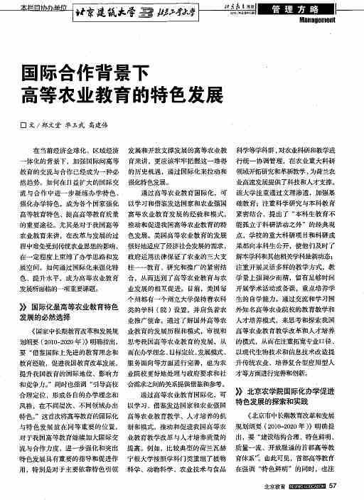 《国家中长期教育改革和发展规划纲要(2010—2020年)》明确指出要“借鉴国际上先进的教育理念和教育经验,促进我国教育改革发展,提升我国教育的国际地位、影响力和竞争力。”同时也要强调“引导高校合理定位,形成各自的办学理念和风格,在不同层次、不同领域办出特色。”这首次将高等教育的国际化与特色发展放在同等重要的位置,对于我国高等教育继续加大国际交流与合作力度、进一步强化和突出特色发展具有重要的指导和促进作用,特别是对于主要依靠特色引领发展和开放支撑发展的高等农业教育来讲,更应该牢牢把握这一难得的历史机遇,通过国际化来拉动和强化特色发展。