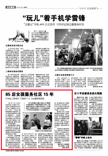 昨天,服务辖区内高龄、空巢老人的“耆援青年志愿者服务队”在陶然亭街道正式成立,这是西城区睦邻社会工作事务所组织的又一支志愿服务队。该事务所的负责人,85后女孩郑丝雨说:“今年我们的目标是再成立30支志愿者队伍。”
