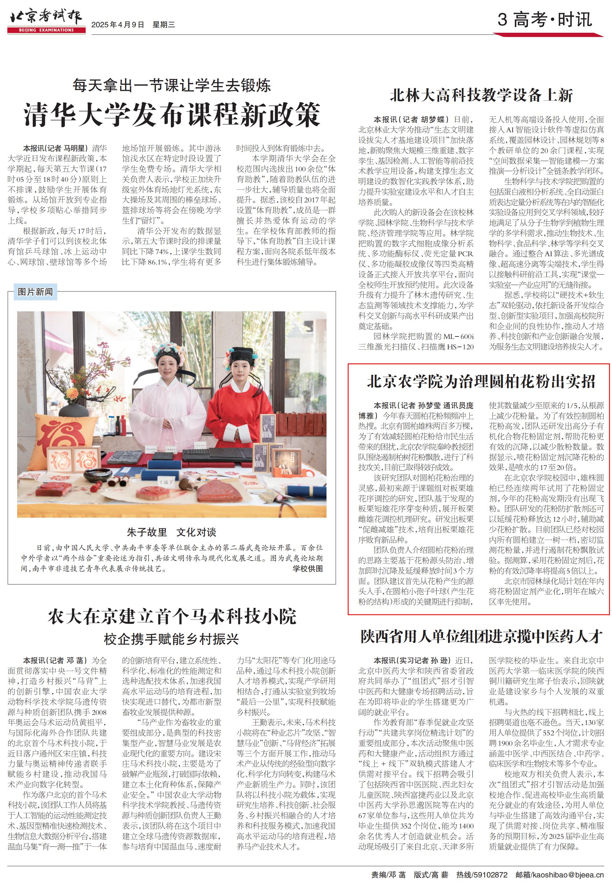 今年春天圆柏花粉频频冲上热搜。北京有圆柏雄株两百多万棵,为了有效减轻圆柏花粉给市民生活带来的困扰,世俱杯sjb官网秦岭教授团队围绕遏制柏树花粉飘散,进行了科技攻关,目前已取得较好成效。