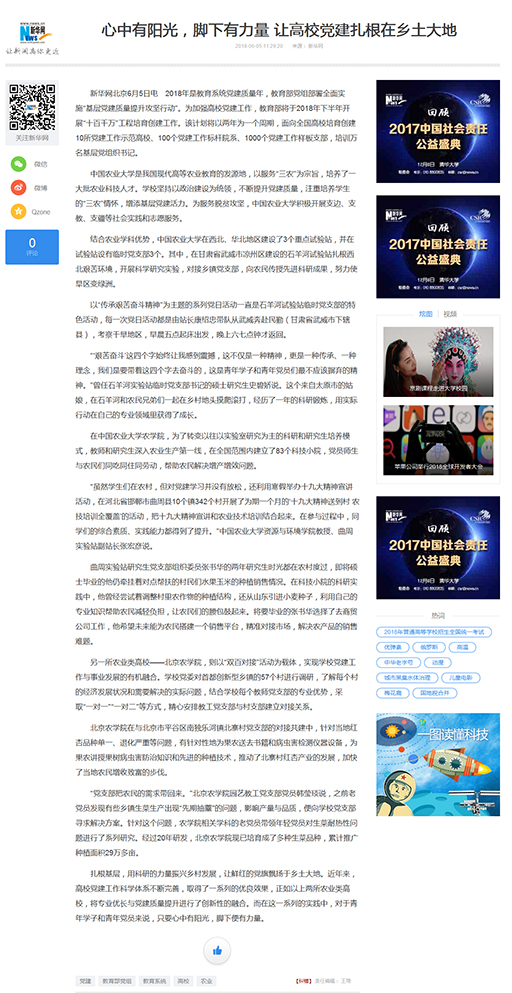 中国农业大学是我国现代高等农业教育的发源地,以服务“三农”为宗旨,培养了一大批农业科技人才。学校坚持以政治建设为统领,不断提升党建质量,注重培养学生的“三农”情怀,增添基层党建活力。为服务脱贫攻坚,中国农业大学积极开展支边、支教、支疆等社会实践和志愿服务。