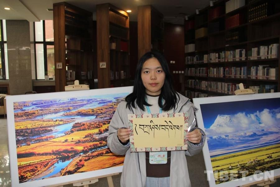 图为参与互动的熊同学展示自己学写的藏文