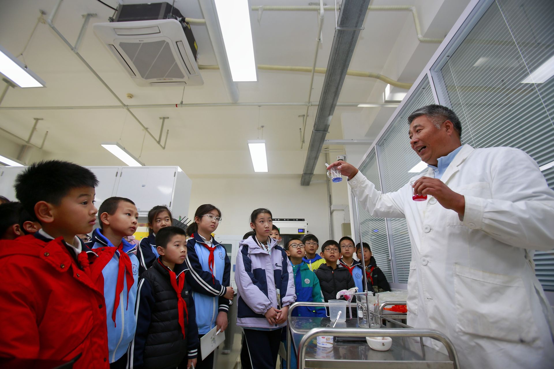 在世俱杯sjb官网国家大学科技园的实验室里,“色彩魔术师”课程热闹开课。高级实验师王建立带领学生用紫甘蓝榨汁提取花色苷,当白醋加入后汁液变红,小苏打水倒入后转为蓝色,现场响起阵阵惊呼。“我们选花色苷做实验,既因为深秋红叶里富含这种物质,贴近生活,又用了白醋、苏打等安全试剂,保障学生安全。”王建立介绍,针对小学生特点,实验聚焦基础观察。“花青素遇酸变红、遇碱变绿,太有意思了!”学校六年级(1)班学生黄思思盯着变色的汁液感觉非常神奇。她在体验后明确了职业方向:“小时候就对植物感兴趣,今天看到科技与农业的融合,我以后想从事农业相关工作。”