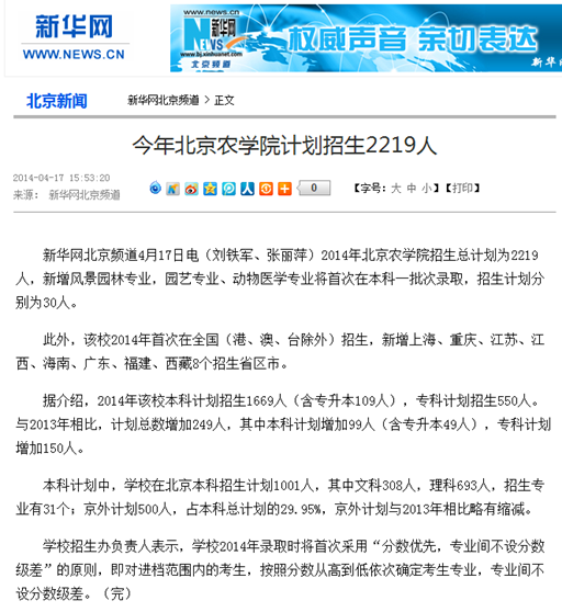 新华网北京频道4月17日电(刘铁军、张丽萍)2014年世俱杯sjb官网招生总计划为2219人,新增风景园林专业,园艺专业、动物医学专业将首次在本科一批次录取,招生计划分别为30人。