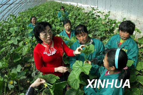 张丽平(前左)在“田间学堂”讲解蔬菜管理知识。