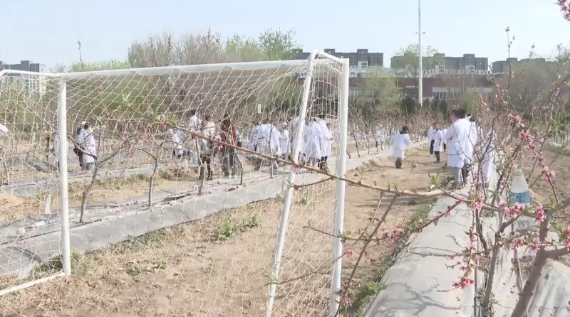 镜头切换到学校的户外果园里,教育教学活动正在进行。这堂课比较特殊,在果树间的空地上,拉起一道排球网,旁边的林间空地上,还设置了足球的“球门”。园艺专业的同学们分成几个小组,投身到排球和足球运动中。在林中、在花间,这场春日运动别有韵味。