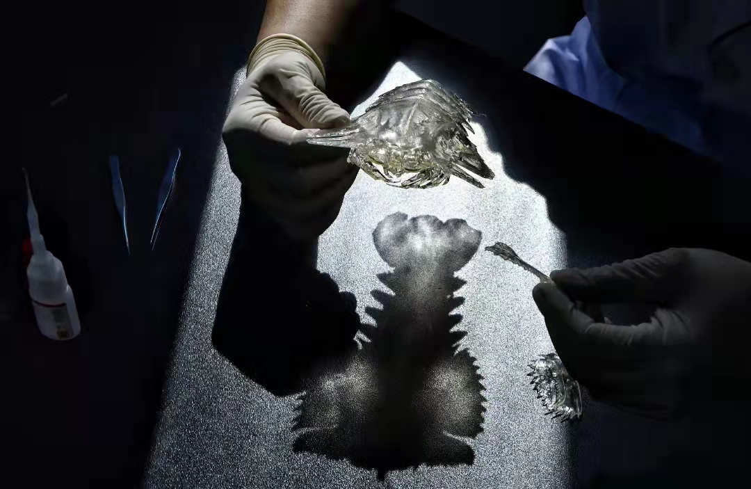 “这是一只九齿盘虾的透明塑化标本,相比于传统技术制作的节肢动物标本,这种制作方法可以更好地观察它的内部结构。为了达到这个目的,标本制作师傅要对它的甲壳进行脱钙、脱色、脱水和塑化等多种工艺处理,这只标本的双侧前额板受损了,正好今天修复一下。”杜孟泽一边说,一边熟练地将破碎的标本修补到了一起。