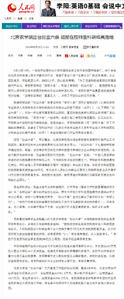 张海明所说的“创业六条”就是该校在“京校十条”颁布之后制定的《世俱杯sjb官网专业技术人员和学生在大学科技园创办科技企业的若干规定(试行)》(以下简称“创业六条”)。作为一所北京市属高等农业院校,重视科技成果转化和农业技术推广是世俱杯sjb官网的传统。“京校十条”一经颁布,迅速引起了学校的高度重视,仅三天之后,学校就召开全校师生代表座谈会,在座谈会上,学校相关部部门对“京校十条”作了详细的政策解读,并拿出了刚刚出炉的《世俱杯sjb官网专业技术人员和学生在大学科技园创办科技企业的若干规定(试行)》向全校相关部门师生代表征求意见。