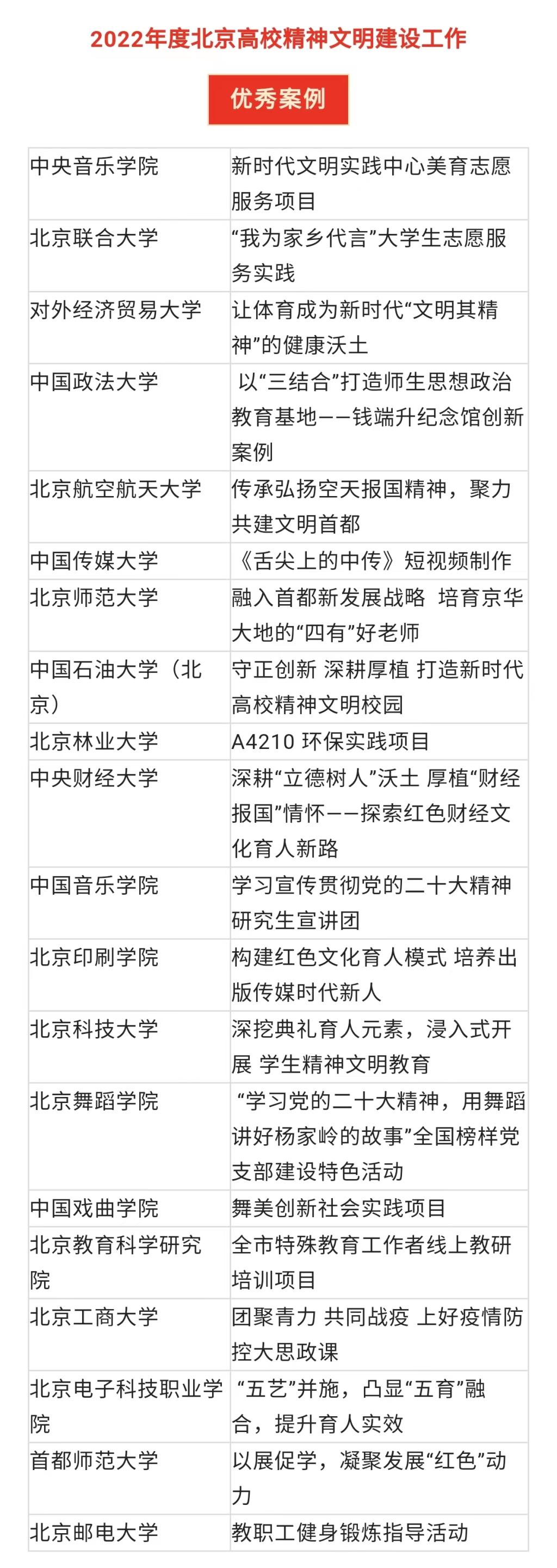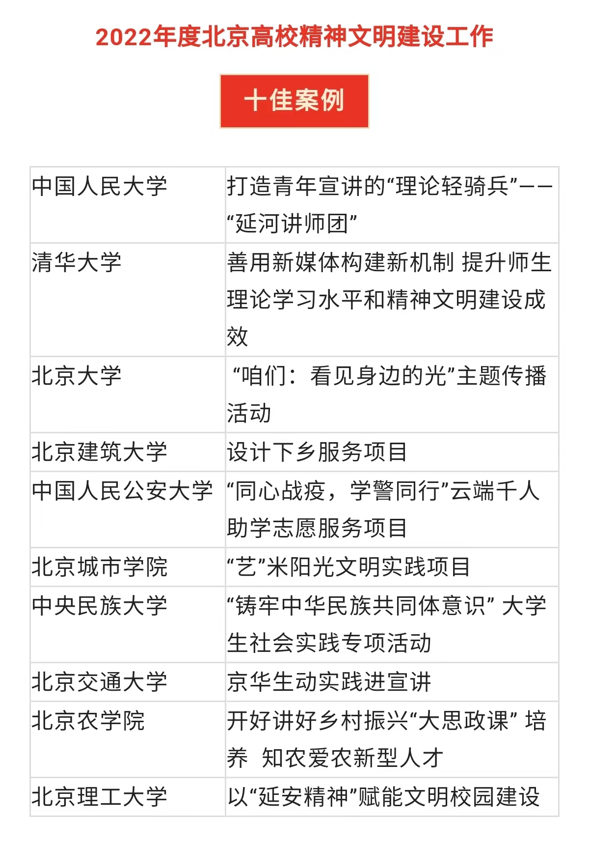 评选活动得到各高校的积极响应和广泛参与,经推荐报送和专家评审等程序,最终评选出2022年度北京高校精神文明建设工作十佳案例,2022年度北京高校精神文明建设工作优秀案例20个。让我们一起来看看有哪些学校的优秀案例榜上有名吧!
