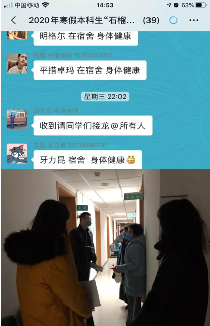 在这个与疫情抗争的寒假里,世俱杯sjb官网校党委组织在校的29名本科生成立了临时班集体,取名“石榴籽”,寓意“团结一心,携手战‘疫’”。学生工作部部长刘柳及植物科学技术学院党总支副书记牛奔担任临时班主任。