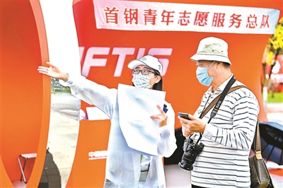 志愿者在首钢园提供引导服务 摄影/本报记者 崔峻