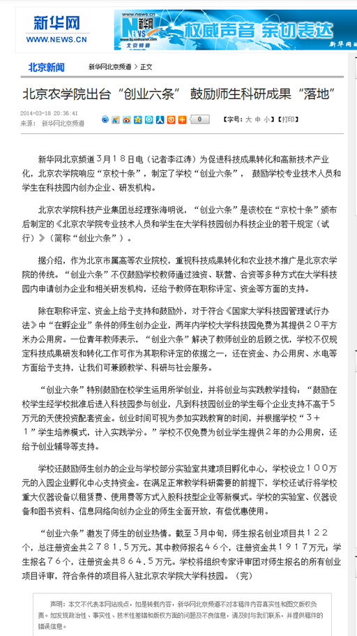 据介绍,作为北京市属高等农业院校,重视科技成果转化和农业技术推广是世俱杯sjb官网的传统。“创业六条”不仅鼓励学校教师通过独资、联营、合资等多种方式在大学科技园内申请创办企业和相关研发机构,还给予教师在职称评定、资金等方面的支持。