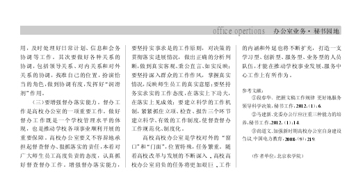 高校高校办公室是学校对外的“窗口”和“门面”,位置特殊,任务繁重。随着高校改革与发展的不断深入 , 高校高校办公室肩负的任务将更加艰巨 , 工作的内涵和外延也将不断扩充,打造一支学习型、创新型、服务型、业务型的人员队伍,才能在推动学校事业发展、服务中心工作上有所作为。(上接第 97 页)档案管理办法》等法规及教育部颁布的“国家示范性骨干高职院校建设计划单位”的总体目标,结合我院实际情况制定并完善教学档案管理工作的各项规章制度,并确定教学档案管理人员及其职责范围,使教学档案管理人员树立起强烈的责任心、进取心,做到教学档案管理与教学工作同步进行。要实行“三纳入”、“四同步”即纳入教学计划、规划及教学管理,纳入各级管理人员岗位责任制,纳入考核教学质量和水平条件之一。下达教学任务与指出教学文件材料的归档要求同步;检查教学工作与检查教学文件材料形成积累同步;评审、鉴定教学质量、毕业论文、优秀教学成果与审查、验收档案材料同步;毕业分配、上报评审材料、教师考核晋升与档案部门出具归档证明同步。只有这样,才能使教学档案的归档系统、完整,让其价值得以实现。