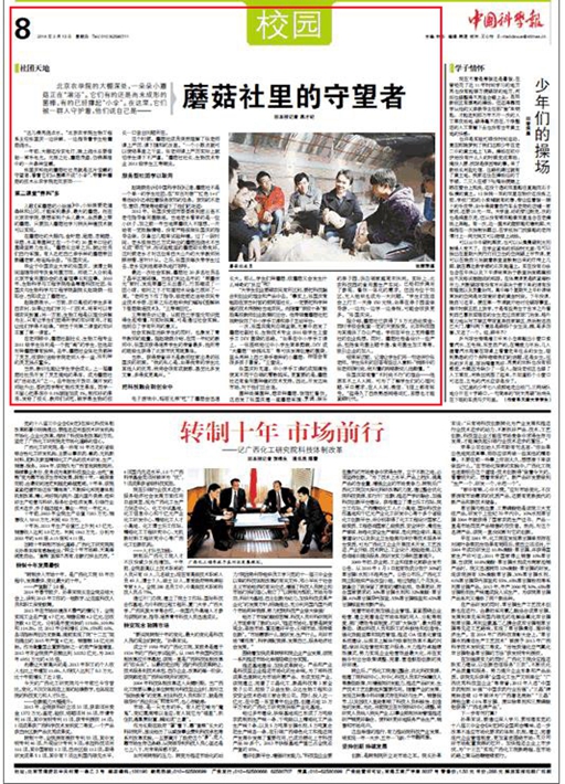 最近一次社会实践,蘑菇社20多名社员去了昌平区南邵镇。当他们到达去年的“栗蘑状元”家时,发现栗蘑已长出菌孔、竹荪缩成了一团小球,细问之下才知道控水设备已损坏了一周。“老师当下作了指导,临走前还送给农民专业技术手册,回来之后还组织我们编写《图解林下香菇栽培技术》。”王寿南回忆。